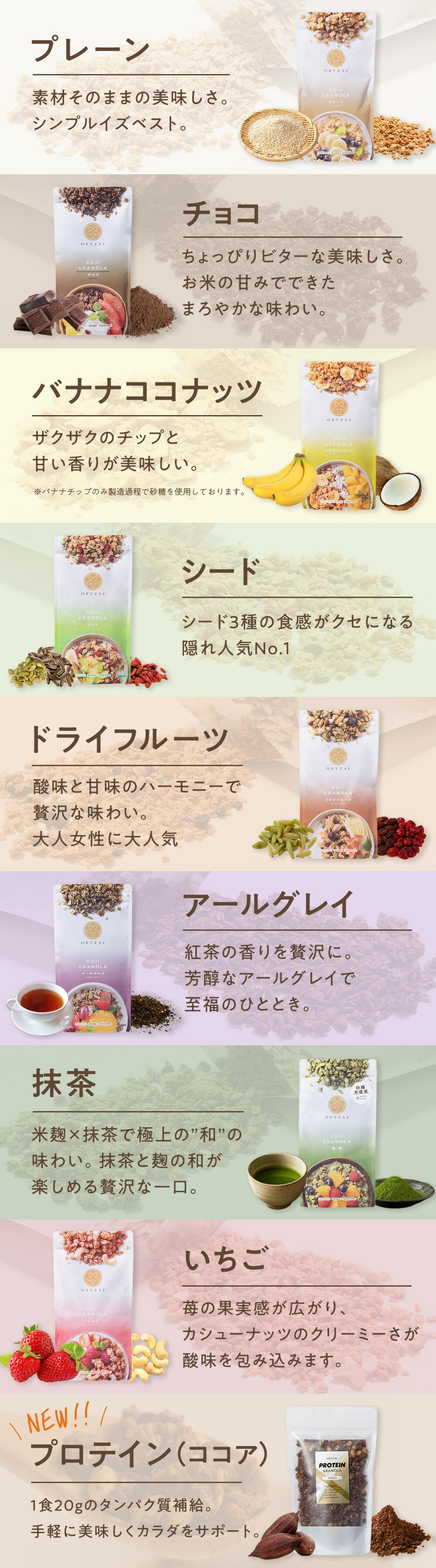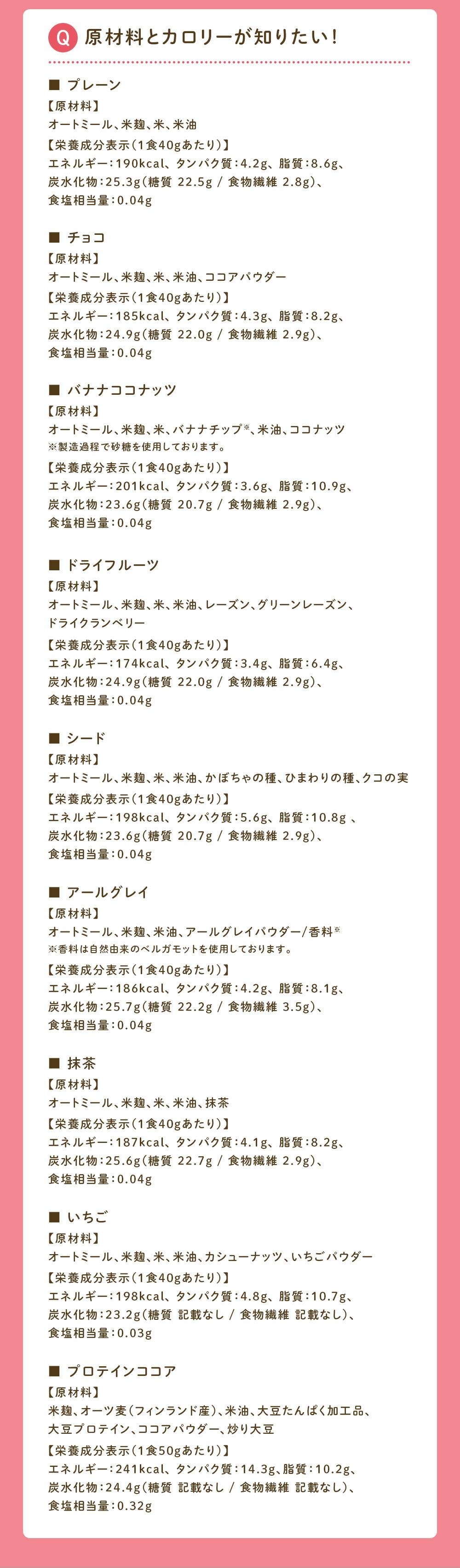 オートミール、米麹、米、米油、カシューナッツ、いちごパウダー